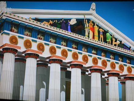 本当のパルテノン神殿は、柱部分は大理石の白色ですが、建物上部の横長のフリーズ部分は艶やかな色彩で覆われていたようです。