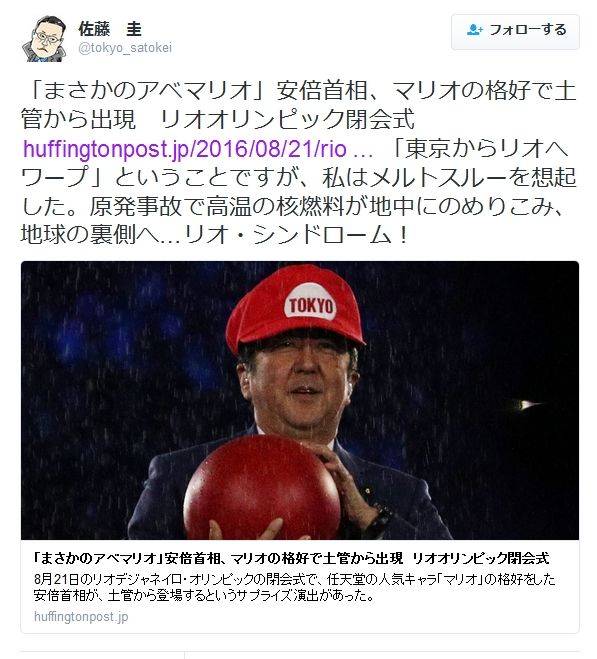 東京新聞記者「まさかのアベマリオ。メルトスルーを想起した。原発事故で高温の核燃料が地球の裏側へ…リオ・シンドローム!」