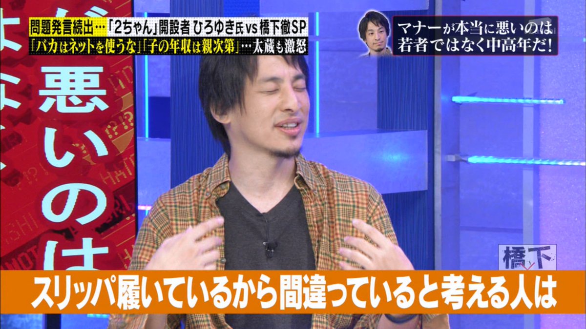 ひろゆき「スリッパ履いてるから間違っていると考える人は頭悪いと思っている」 pic.twitter.com/Jm1CSL4IqU