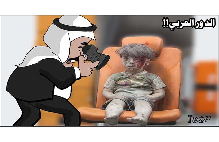 アレッポで空爆後の廃墟から救い出された少年の画像が世界中の涙を誘っていますが、この風刺画はアラブ人の自嘲でしょうか?