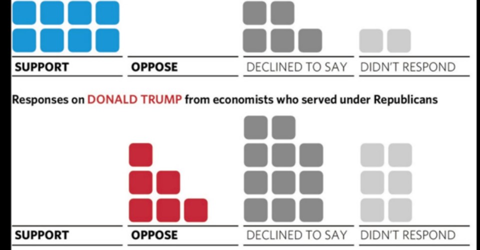 Today Ben Leubsdorf, Eric Morath, and Josh Zumbrun of the WSJ published the results of a survey of all living former members of the president’s Council of Economic Advisers, with service dating back to the time of Richard Nixon. Not one of them expressed support for Donald Trump. All of the Republicans who expressed a preference opposed him.