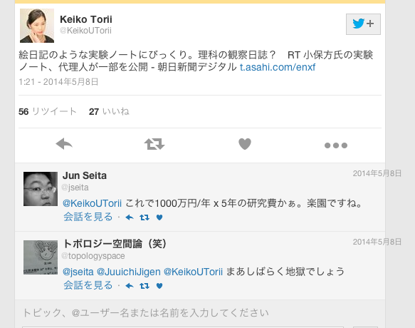世論がそう言っても、学会や文科省がそれを否定するのです。STAP細胞は有望な仮説であるということ自体を否定しているのです。困ったもんです。学会や文科省は「反科学的」であると言えます。言葉を変えれば「売国奴」です。