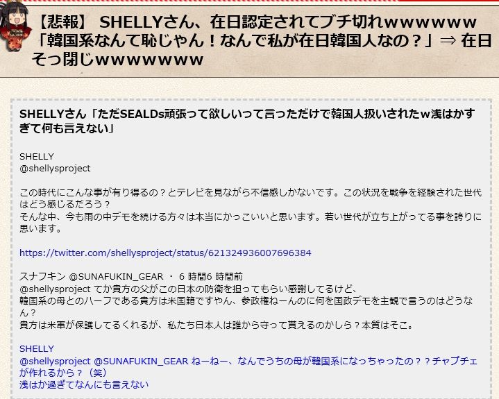 例えば、デマしか書かないことで有名な日本有数のネトウヨサイト『あじあにゅーす2ちゃんねる』は、女優のSHELLYさんが在日認定されて怒った際に、SEHLLYさんが韓国系を恥だと思っているから、韓国人扱いされて怒った、というデマ見出しを勝手につけていました。