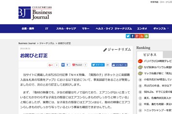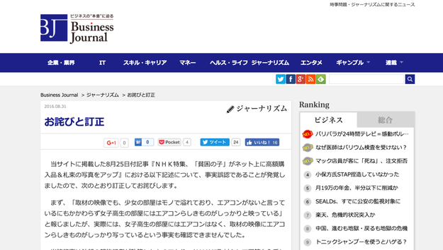 株式会社サイゾーが運営するニュースサイト「Business Journal(ビジネスジャーナル)」は8月25日付の記事「NHK特集、『貧困の子』がネット上に高額購入品&札束の写真をアップ」の一部に捏造部分があったと31日、サイトにて謝罪文を掲載した。