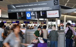 日本路線運航最終日を迎えた成田空港第1ターミナルのオーストリア航空カウンター=16年9月4日 PHOTO: Tadayuki YOSHIKAWA/Aviation Wire