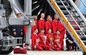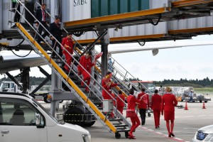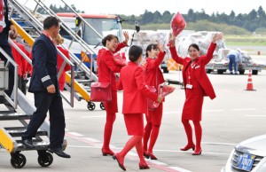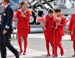 記念撮影を終えて搭乗橋の階段をのぼるオーストリア航空の客室乗務員ら=16年9月4日 PHOTO: Tadayuki YOSHIKAWA/Aviation Wire