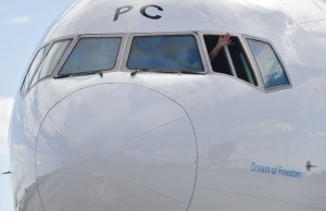 日本発最終便となった成田発ウィーン行きOS52便のコックピットから手を振るオーストリア航空の機長=16年9月4日 PHOTO: Tadayuki YOSHIKAWA/Aviation Wire
