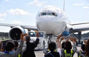 日本発最終便となった成田発ウィーン行きOS52便を見送るANAの地上旅客係員ら=16年9月4日 PHOTO: Tadayuki YOSHIKAWA/Aviation Wire