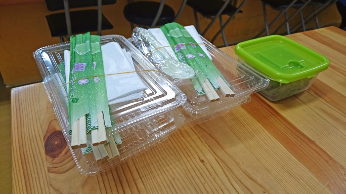 料理より先にテイクアウト用の容器が出てきました(笑) |