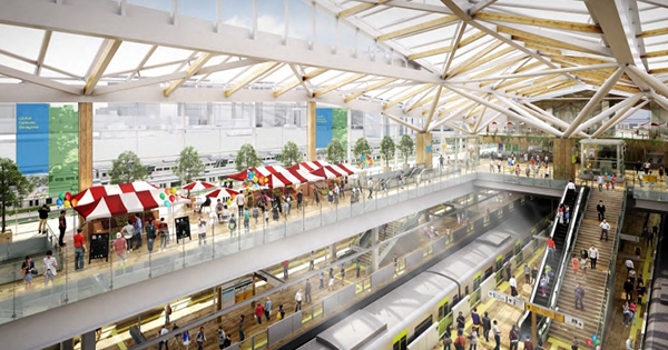 駅舎をデザインするのは新国立競技場の設計を担当した建築家の隈研吾氏で、新国立競技場と同様に、随所に木材を使っている。また屋根は折り紙をモチーフにした和のイメージだ。
