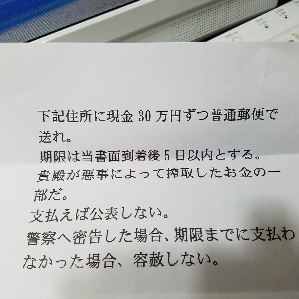脅迫状がきた(*´∀`)♪なう pic.twitter.com/wbrGqJFfuF