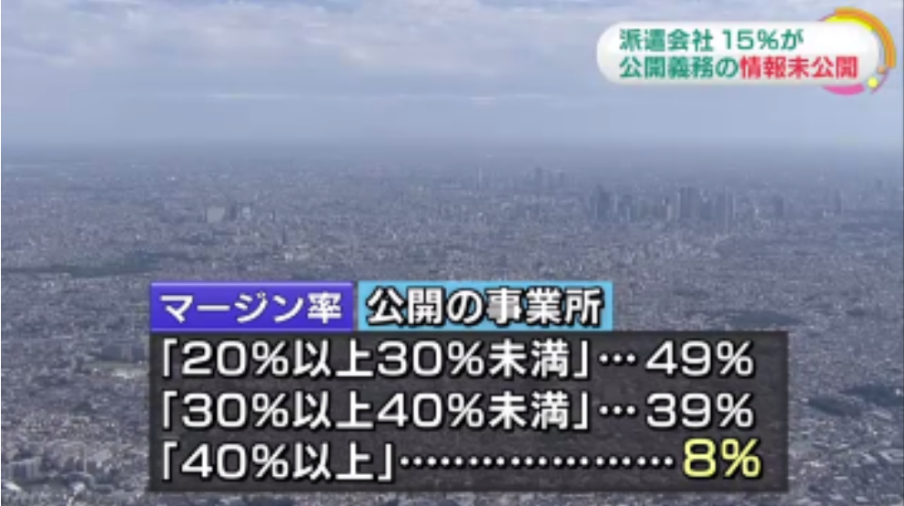 その結果、労働者を派遣して企業から支払われた料金のうち、労働者の賃金を差し引いて派遣会社が受け取った割合、いわゆるマージン率を公開している事業所は73%でした。