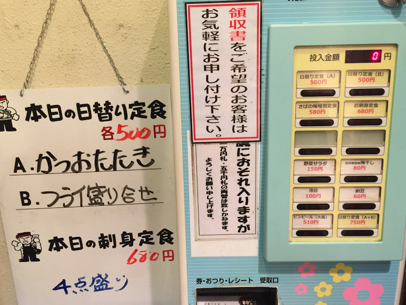 日替わり定食は何年も前から500円(税込)を守っていて、公式ホームページには「曜日替わり定食献立表」として公開されていますが、仕入れの関係か、今日は「かつたたき」「フライ盛り合せ」の二種類でした。