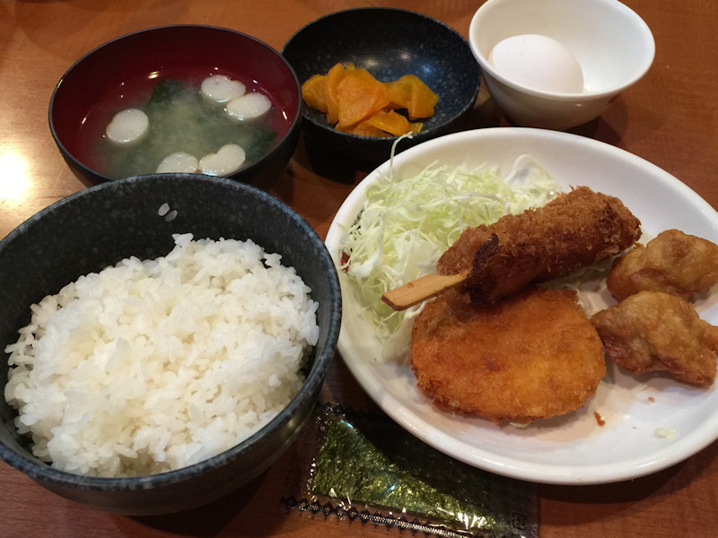 フライは若鶏の唐あげ、大きな牛肉コロッケ、串揚げで、どの揚げ物もホクホクの美味しさです。