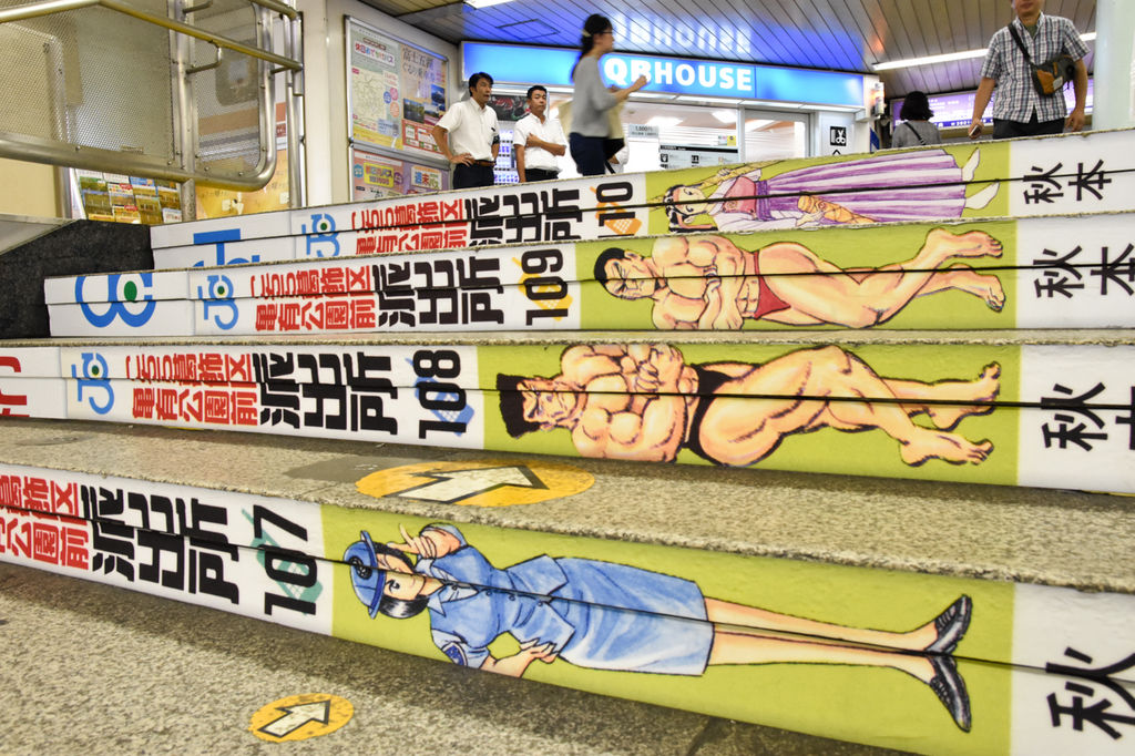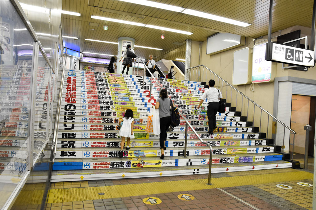 どデカい両さんを踏みしめながら改札の中へ。今度は階段がコミックスの背表紙に!