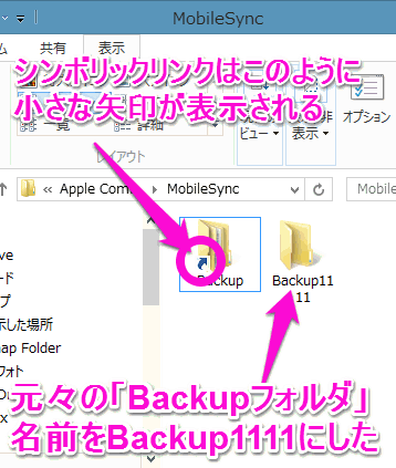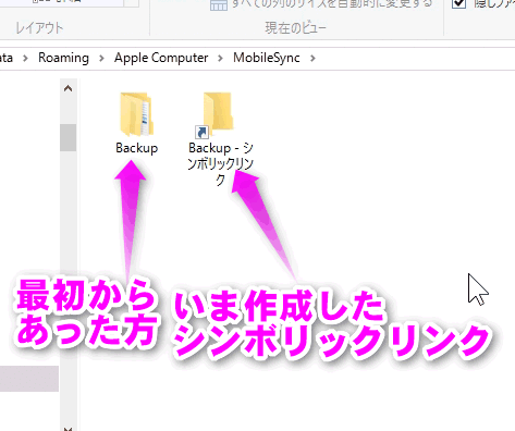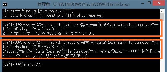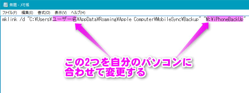 mklink /d "C:\Users\ユーザー名\AppData\Roaming\Apple Computer\MobileSync\Backup" "M:\iPhoneBackUp"