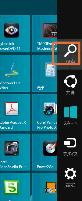 もしそうでない場合、マウスカーソルをモニターの右下(時計の辺り)に持って行くと、画面左側にこのようなアイコンが並んだメニュー(チャームと呼ばれています)が表示されるので、一番上の「検索」をクリックします。