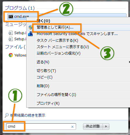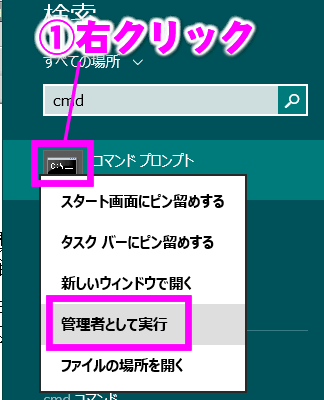 Windows7の場合、スタートボタンをクリックし検索入力欄に「cmd」と入力し、表示された「cmd.exe」を右クリックし、「管理者として実行」を選択し、コマンドプロンプトを管理者権限で立ち上げます。