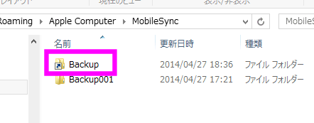 すでにバックアップをしたことがある場合、この「Backup」を開くと長い名前のフォルダが作成されていると思います。