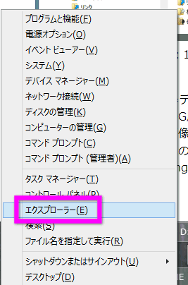 Windowsキー」と「Xキー」を同時に押すと左のようなメニューが表示されるので、「エクスプローラー」をクリックします。