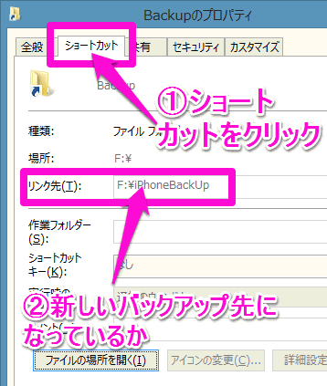 シンボリックリンクも作成できました。と表示され、BackUpのところに矢印も表示されたのですが、プロパティまで行くとリンク先が空白となっているのです。。