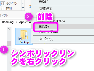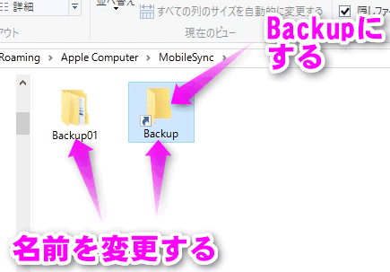 rmdir "C:\Users\ユーザー名\AppData\Roaming\Apple Computer\MobileSync\Backup"
