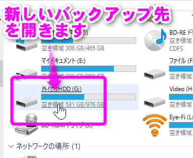 バックアップ先は外付けHDD(以前使用していたPCのHDDを取出しケースにそのまま入れたもの)です。