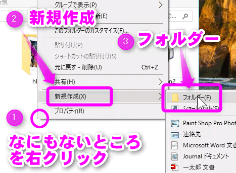 ①何もない部分を右クリックし、②「新規作成」をクリック。③「フォルダー」をクリックします。