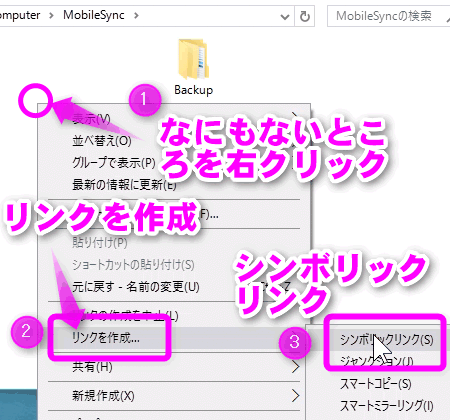 続いて、シンボリックリンクという特殊なフォルダを作成します。
