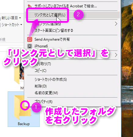 先ほどインストールした「Link Shell Extension」が入っていると、このように「リンク元として選択」という項目が右クリックメニューに加わります。