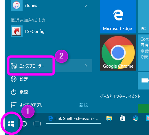 まずはエクスプローラーを起動します。①「スタートボタン」をクリックして、スタートメニューから②「エクスプローラー」をクリックします。