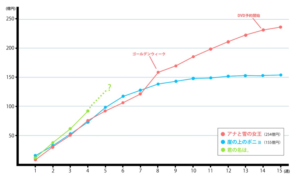 『君の名は。』興行収入100億円突破がニュースになっていますが、興行収入ウォッチャーとしてはそれどころではないぞと言いたかったのでグラフにしてみました。現状だと200億すら簡単に到達しそうに見えます。 pic.twitter.com/VaWDaxELHw