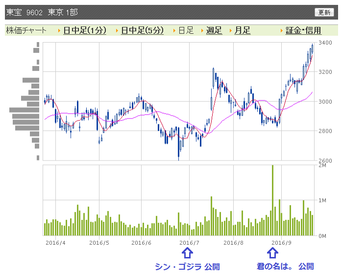 「君の名は。」興行収入 100 億円越えスゴイし東宝株がブチ上がってるのもスゴイ