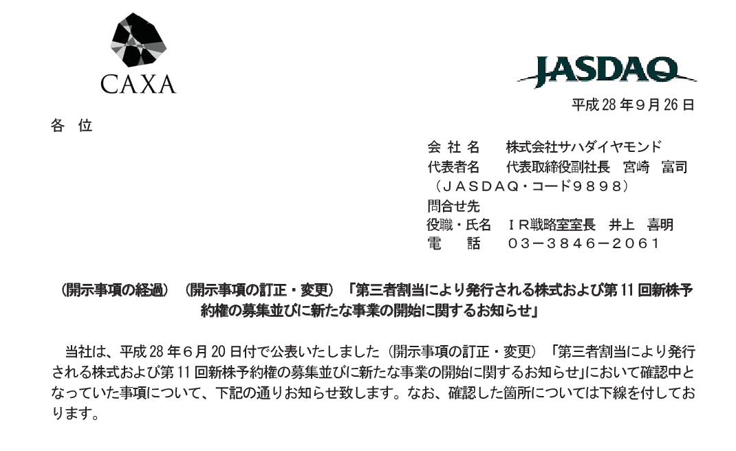 (開示事項の経過)(開示事項の訂正・変更)「第三者割当により発行される株式および第11回新株予約権の募集並びに新たな事業の開始に関するお知らせ」