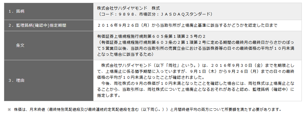 サハダイヤあと4日間の平均株価が22円以上且つ月末終値が10円以上になってないと上場廃止確定か