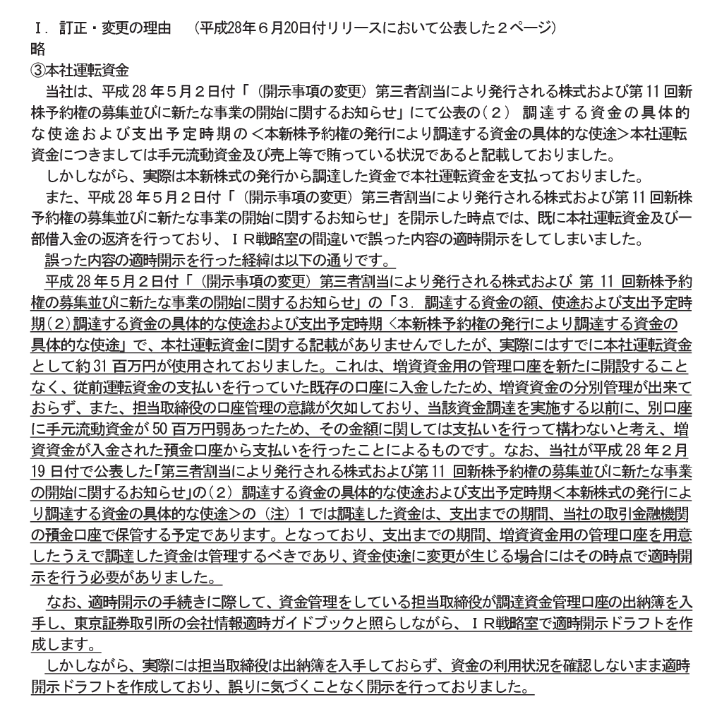 なお、担当取締役が資金使途の変更の適時開示について実施しなかったのは多忙をきわめており、忙殺され準備するのを忘れていたため