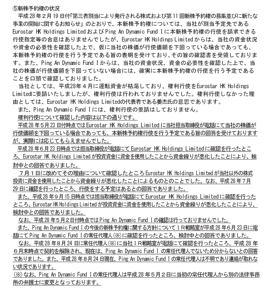 常 任代理人に当社IR戦略室が電話にて確認を行ったところ、平成28年6月末時点で契約を解除されPing An Dynamic Fund I の常任代理人でないため分からないとの回答でありました。現在、Ping An Dynamic Fundの常任代理人は不明であり連絡が取れない状況