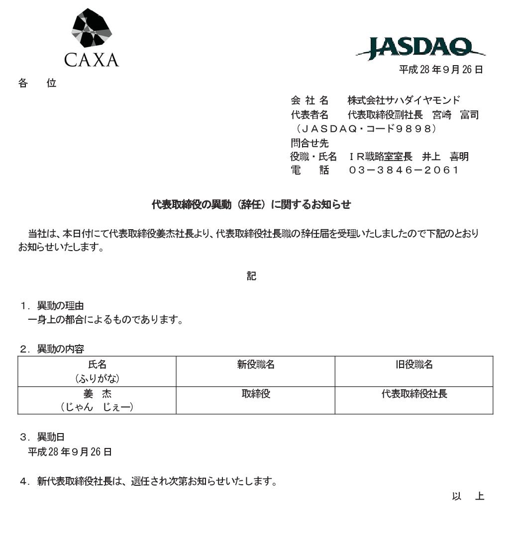 2016/09/26 15:00 サハダイヤモンド 代表取締役の異動(辞任)に関するお知らせ