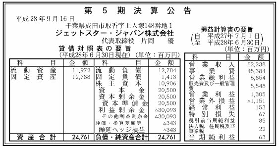 ジェットスター・ジャパン株式会社(非上場)の2016年6月期決算