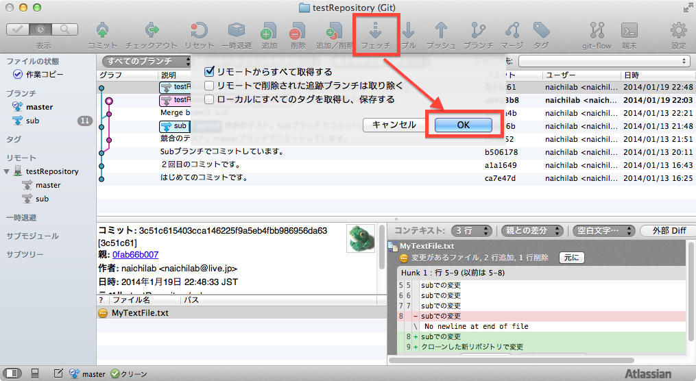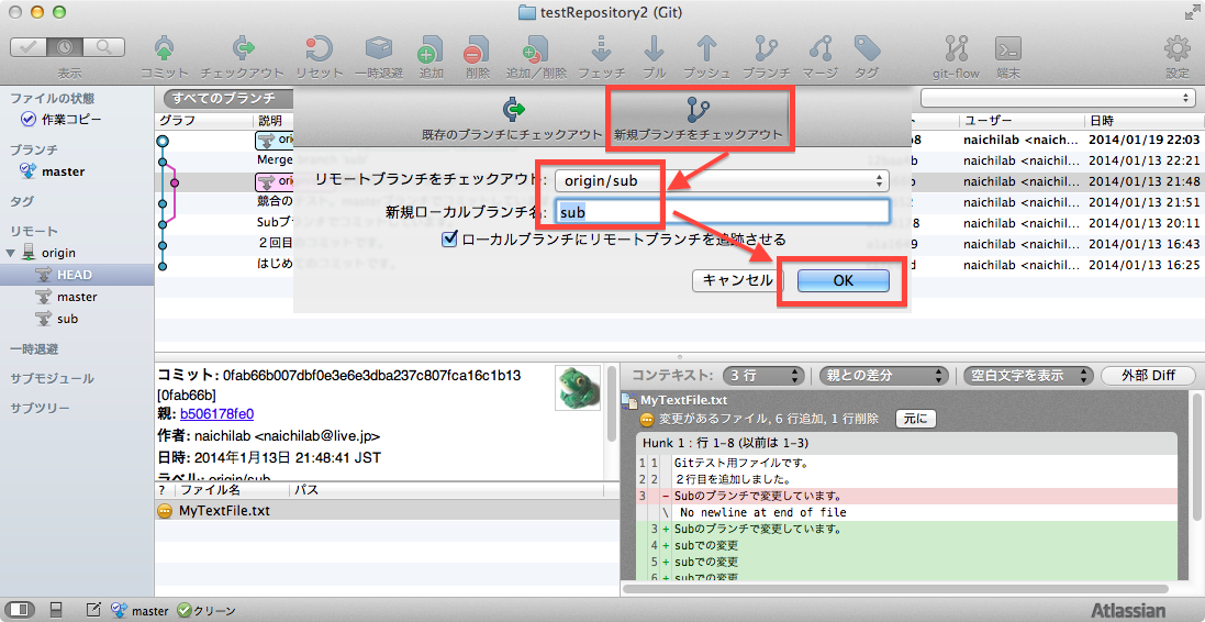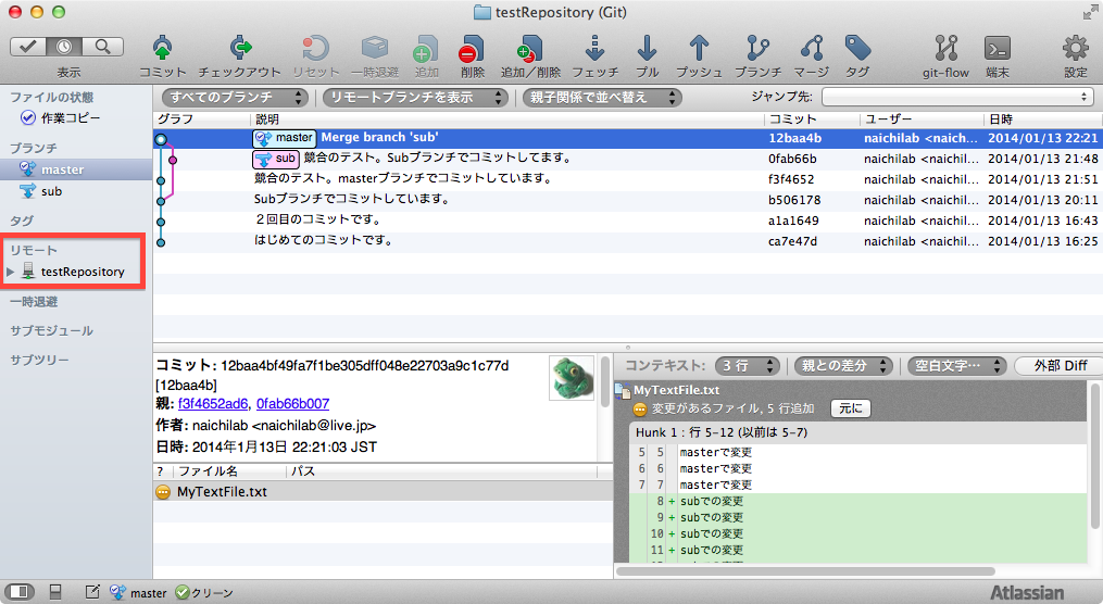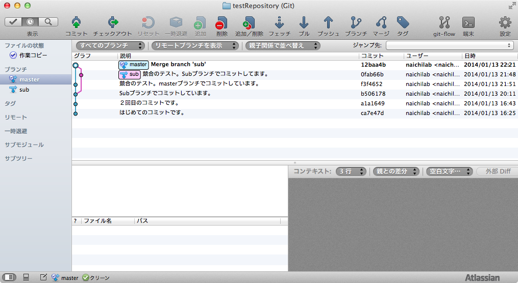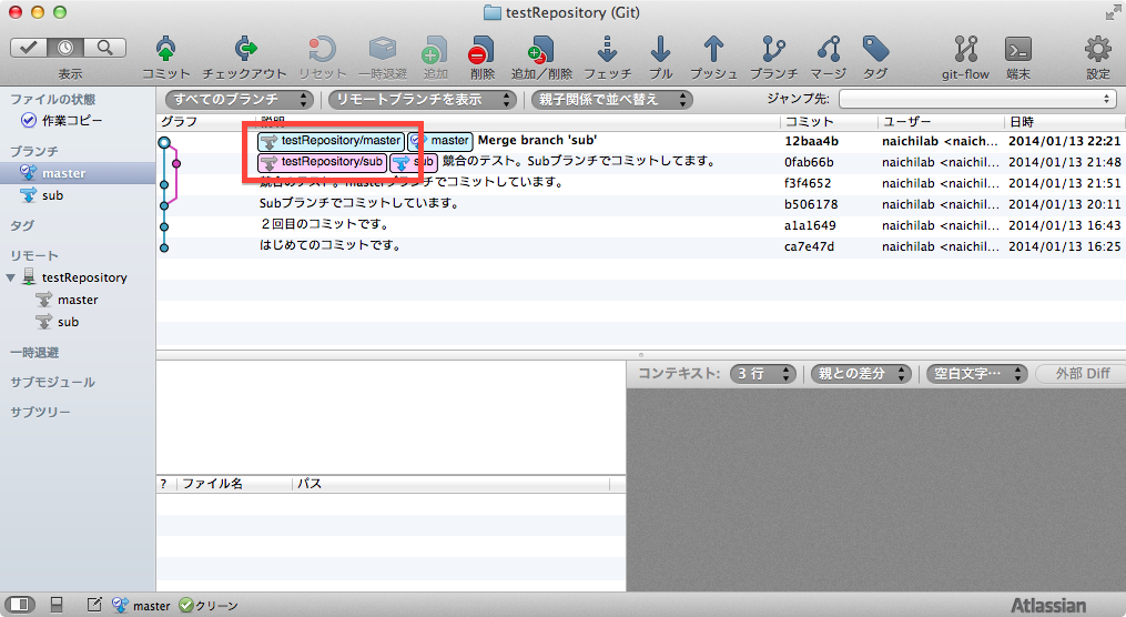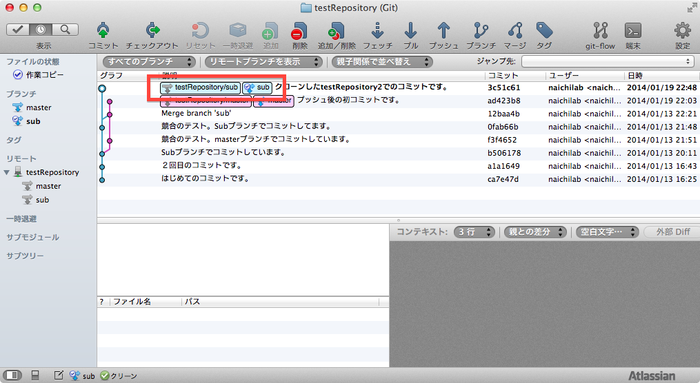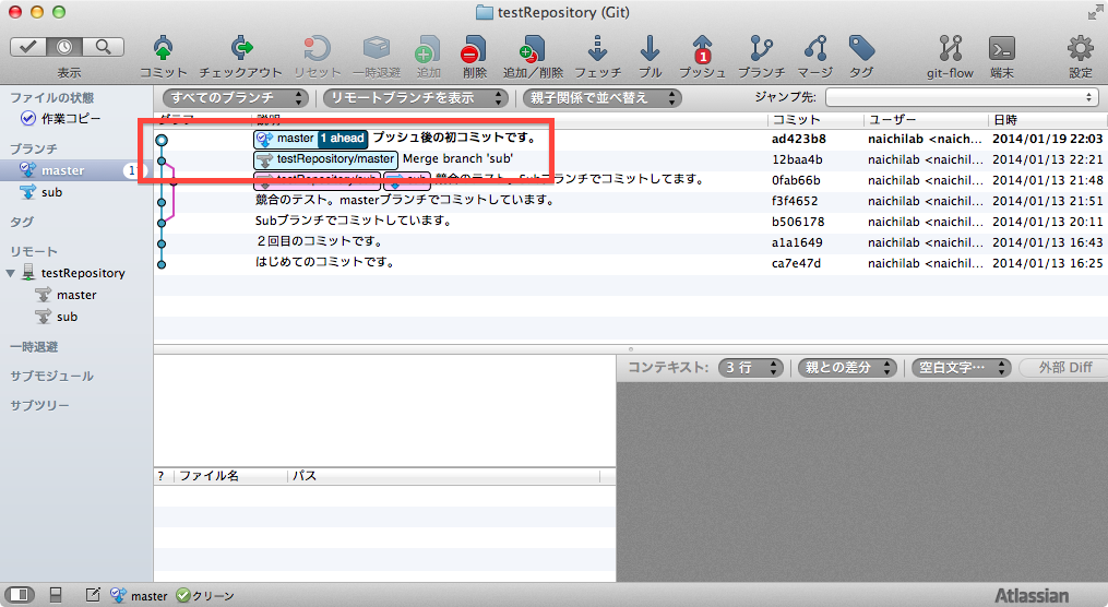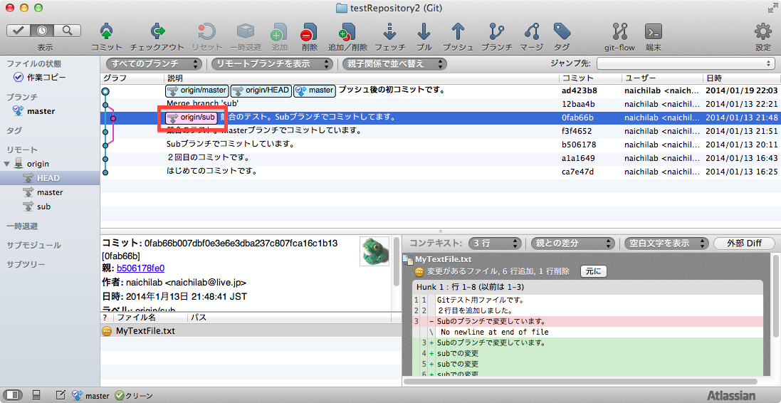 ・ローカルブランチはmasterのみ、リモートブランチはmaster,sub,HEADの3種であることに注意してください。