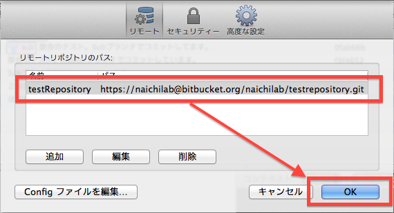 リモートリポジトリ情報が追加されているのを確認してOK