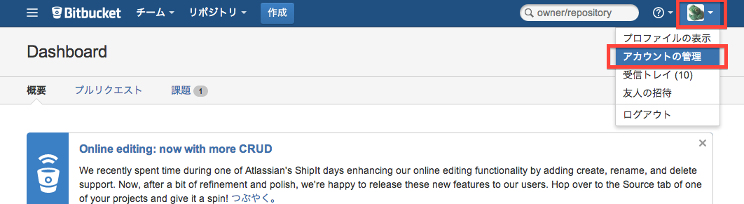 正しくBitBucketアカウントが表示されればOKです。