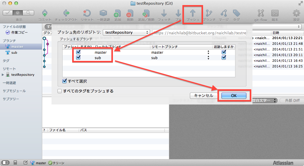 プッシュ->書き込むブランチを指定->OK