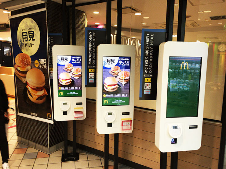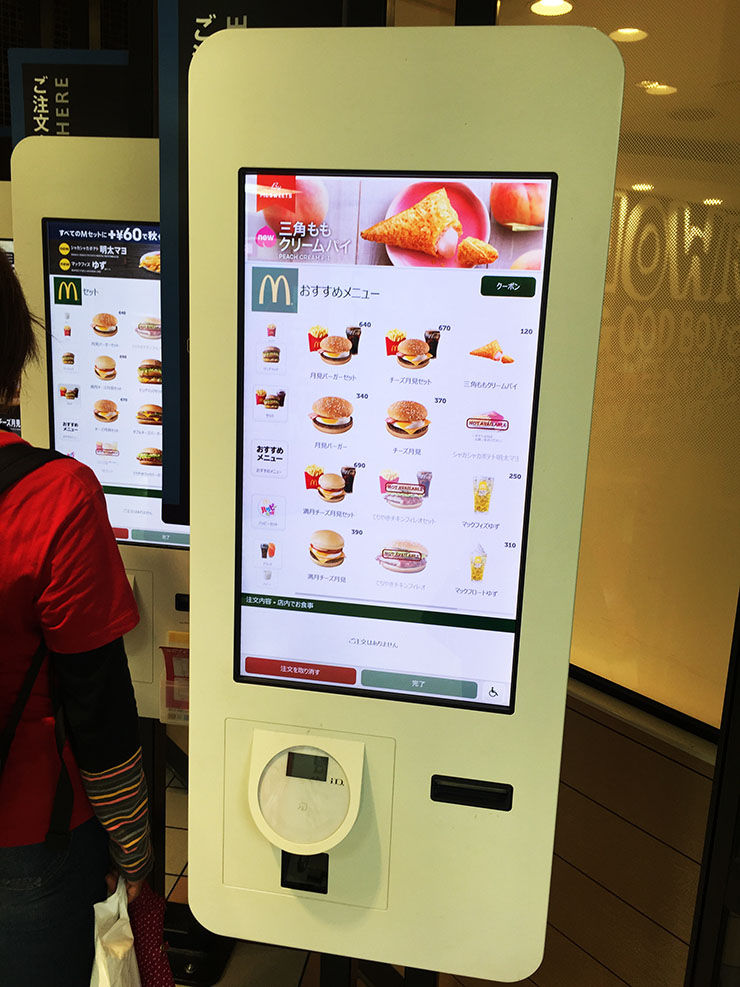 北米やヨーロッパの店舗で導入して好評を得ている、マクドナルドの無人オーダー機。客はタッチパネル式のモニターでハンバーガーやサイドメニューなどを選び、支払いはクレジットカード。料理の受取だけスタッフからしてもらうという販売方法だ。