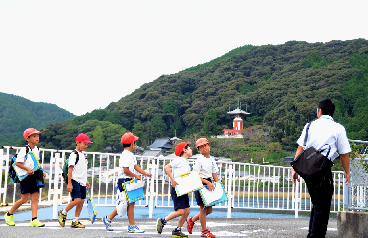 (2016.10 徳島県にある日和佐小学校の校外学習にて。薬王寺が見える(提供:時事通信))