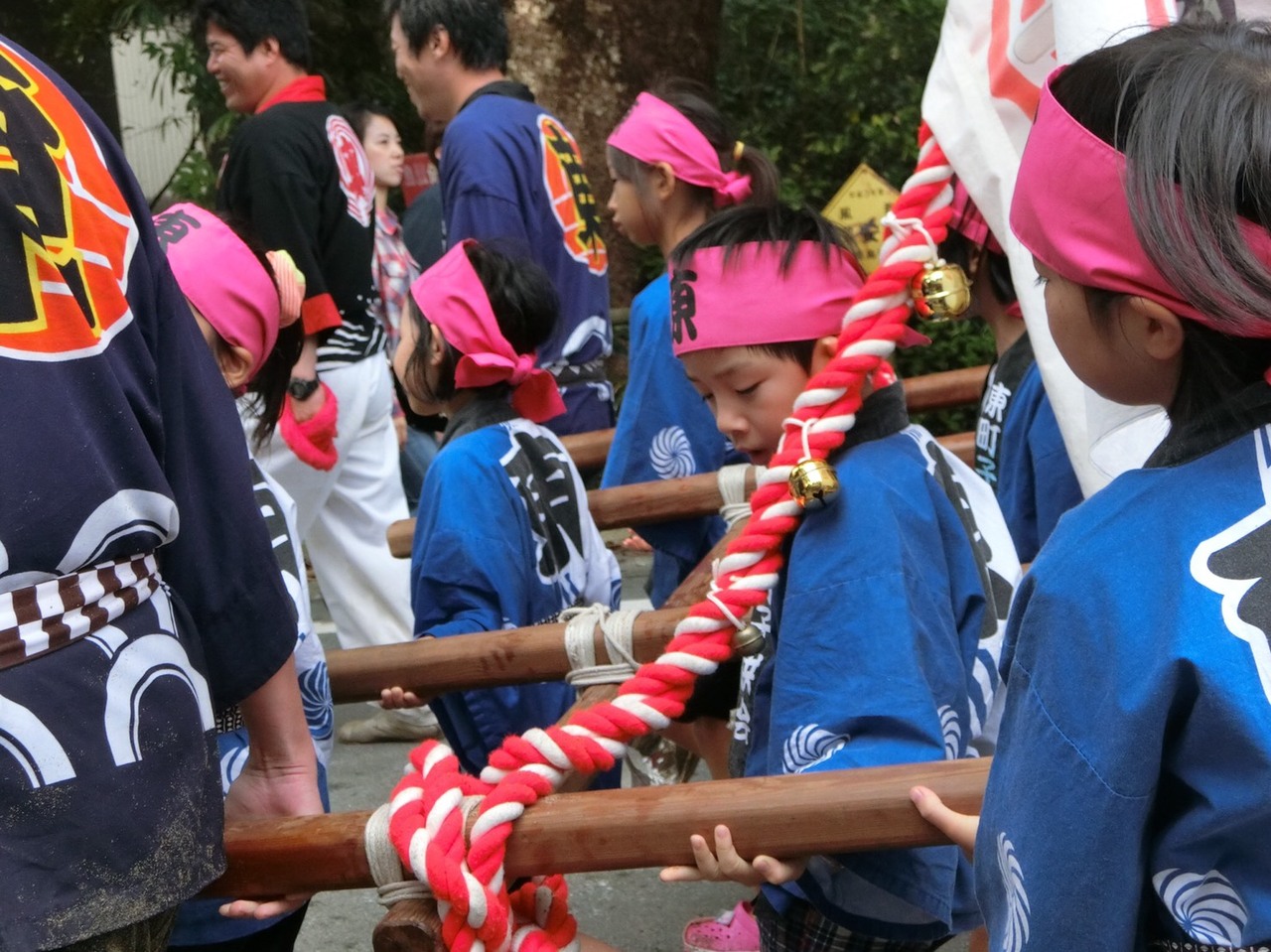 (2016.10 美波町の秋祭りちょうさ。隣町のこどもみこしを担ぐ。)