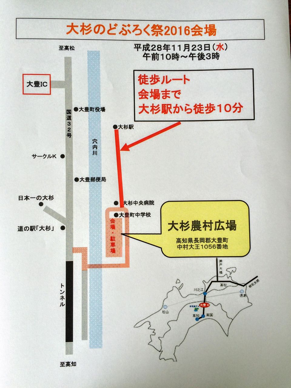 祭り会場は、高知県長岡郡大豊町中村大王1056番地にある大杉農村広場です。
