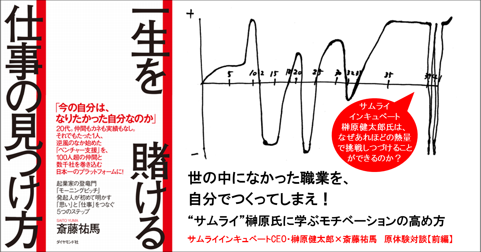 同じくスタートアップ企業の支援をミッションとする「盟友」斎藤祐馬氏が、著書『一生を賭ける仕事の見つけ方』で大好評のノウハウ「感情曲線」をもとに、榊原氏の「モチベーション」の原点に迫る!
