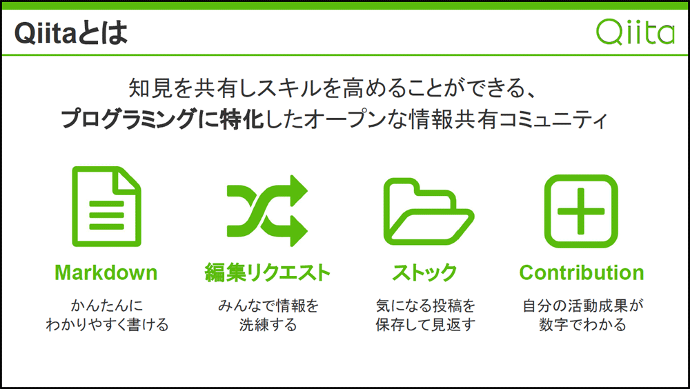 Qiitaの特徴としては、Markdownで書くことができ、プログラマーにとっての書きやすさを追求していること、編集リクエスト機能によって修正や追記を別のユーザーから提案できること、ストック機能によって気になる投稿を保存でき、ユーザーからの評価を可視化できること、ユーザーページでQiita全体への貢献度(Contribution)を可視化することで、モチベーションを維持できること、の4点が挙げられた。