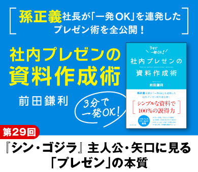 孫正義氏の「一発OK」を次々に取り付けた伝説的プレゼンテーターで、ベストセラー『社内プレゼンの資料作成術』著者の前田鎌利氏。彼が講師を務める「ダイヤモンド社プレミアム白熱講座」の開催まで、あと2週間。今回の記事では、映画『シン・ゴジラ』のワンシーンで前田氏が目を付けた「プレゼンのポイント」について解説する。緊急事態に遭遇したときに、上層部の意思決定を正しく導くために、私たちは何をすべきなのか?(構成:前田浩弥)